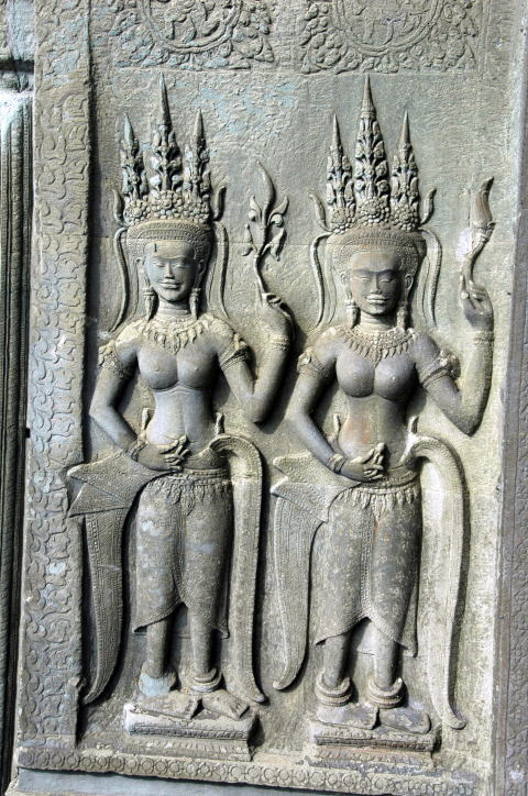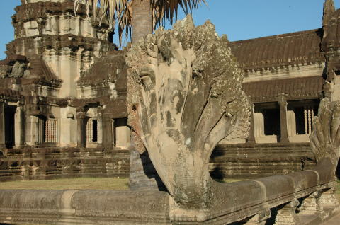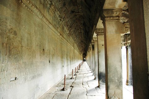 | アンコールワットは、1113年クメール王国の最盛期に建設された。 ヒンドゥー教のヴィシュヌ神をまつる寺院であると同時にアンコール王朝の スールヤヴァルマン2世を埋葬した墳墓でもあるとのこと 王は死後と神と一体化するという思想だ。 左は第一回廊にまつられているヴィシュヌ神 |