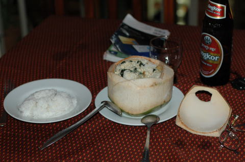 ![]() アモッック・ツレイ ココナッツミルクで蒸した雷魚 椰子の実に入れて出してくれました。なかなかおいしかったです。 ビールの銘柄はアンコール(3ドルほど) |