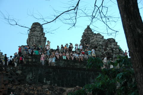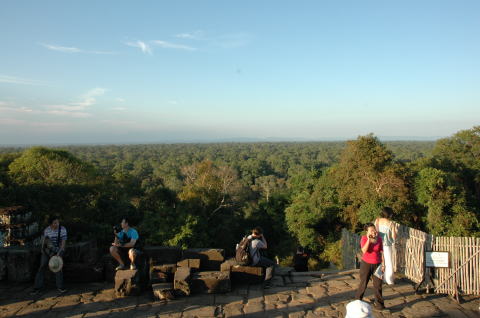 プノンバケンの丘の日没 二日目の最後にプノバケンの丘からの日没を見ようとやってきました。高さ60mの丘、 麓から歩いて15分、360度のパノラマです。 |