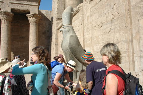| 神殿の入り口には神殿の神であるホルス神(はやぶさの像)がある。黒い玄武岩に刻まれたはやぶさ(ホルス神)の姿が美しい。 | ![]() |