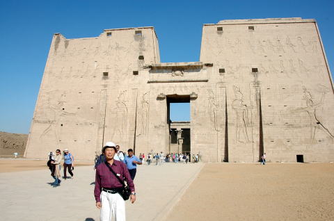 | エドフのホルス神殿 大きな広場にはいると巨大な塔門が見える。 この塔門はカルナク神殿の塔門につぐエジプト第2の大きさだそうだ。 現在の塔門はプトレマイオス朝(BC300年ころ)のころのものだそうだ。 |