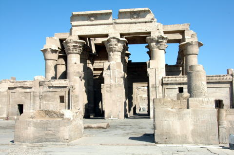 | コムオンボ神殿 ナイル川の岸辺の小高い丘に立つコムオンボ神殿は真ん中に柱があり、右側と左側、それぞれに神が祀られている。 これもプトレマイオス朝(BC300年ころ)のころの神殿です。 |