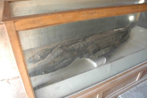 | 上の写真の右側に小さな神殿(礼拝堂)があり、ワニのミイラが二つ安置されていた。ワニはセベク神の聖獣として飼育されていたとのことである。 | ![]() |