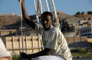 | 途中でこのファルーカを操縦していた人(ヌビア人)が歌を歌ってくれ一緒になって楽しんだ。 | ![]() |