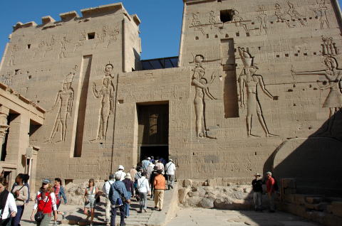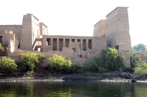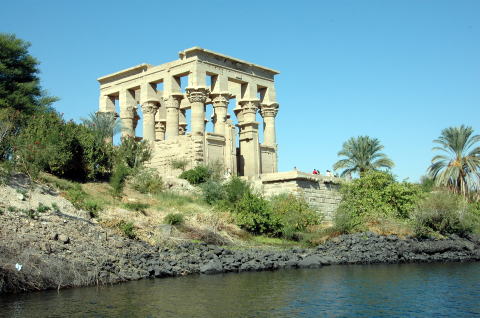 | イシス神殿 以前はフィラエ島にあったがアスワンダムを作ったことにより水中に没するようになってしまった。 そこでユネスコの遺跡救済キャンペーンによって隣のアギルキア島に位置関係などそっくりそのまま移築されたそうだ。 この神殿も多くの建物はプトレマイオス朝(BC300年ころ)のものだそうだ。 船から見るイシス神殿は美しい。 |