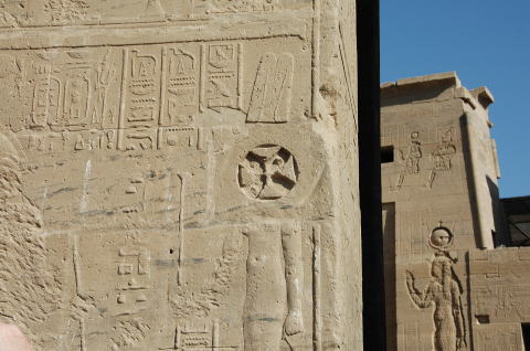 ![]() 神の像の顔の部分が消されキリスト教の十字架が刻まれている。 |