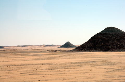 | アスワンからアブシンベルへはバスで移動した。約3時間、途中の砂漠では黒い岩石(玄武岩?)が風化されずに残り富士山のような形の山がいくつも見えた。 | ![]() |