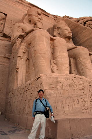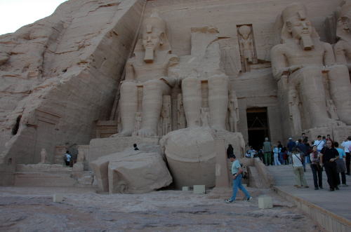 | アブシンベル神殿(ラメセス2世大神殿) この神殿はラメセス2世(BC1275年ころ)が造営したものであり、至聖所にある4体の像が示すように、プタハ神、アメン・ラー神、神格化したラメセス2世、ラー・ホルアクティー神の4体の神に捧げられた神殿である。 神殿の入り口に立つ巨大な像は4つともラメセス2世の像である。 アスワンハイダムを作ろうとしたとき、完成すればそのダムによって水没することが明らかになり、世界中を驚愕させた。 この神殿を救うため世界中から救済案が提案された。その中で、神殿を小さなブロックに切断して移転するというスエーデンの案が採択され、元あった位置から西へ110m、北へ64m移動させることを決めた。近代科学を駆使して現在の位置に移動したという。 小さなブロックに切断したという跡がわからないくらいであった。 |