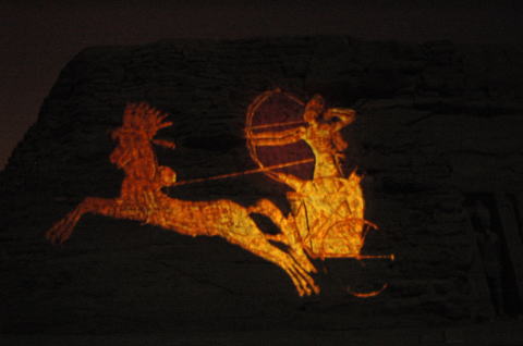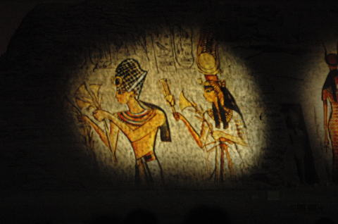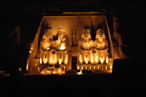 | 光と音のショー この日夕刻からアブシンベル神殿の光と音のショーを見ることができた。 ライトアップされた神殿のみならず、神殿の岩山をスクリーンとしたスライドショーは見事であった。 |
