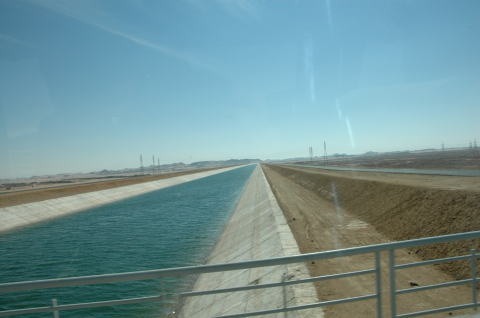 | 砂漠に緑を作るトシュカ・プロジェクト 朝食後バスでアスワンへ、途中の砂漠の中に巨大な水路があった。 ナセル湖(アスワンハイダムの湖)の西にあるトシュカ低地を灌漑するためにアスワンハイダムの水を運ぶ水路だ。 水を送るポンプは日本製だそうだ。 |