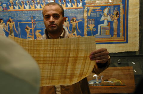 | アスワンで最初に見学したのはパピルスのお店。パピルスの紙に絵を描きそれを販売していた。 | |