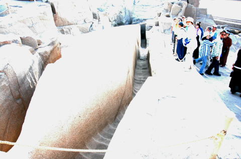 | アスワンの切りかけのオベリスク 続いてアスワンでは石切場に行き、切りかけのオベリスクを見た。 途中に割れ目が出て、そこで中止したのだろうといわれている。 赤みを帯びた花崗岩を機械もない時代によくここまで掘ったものだと感心させられた。 夕方5:30 アスワンから寝台特急ナイルエキスプレスでカイロへ向かった |