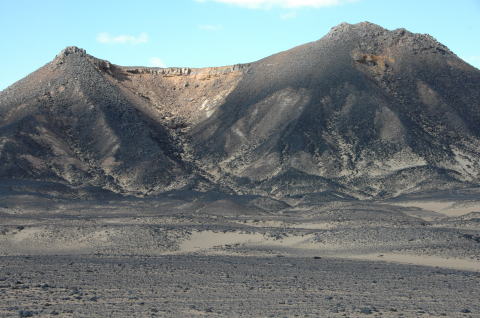 黒砂漠バフレイヤオアシスから4輪駆動車で約1時間。黒砂漠に到着 表面の黒い石は玄武岩、鉄分を多く含んでいるようだ。 |