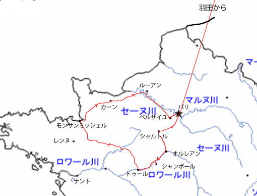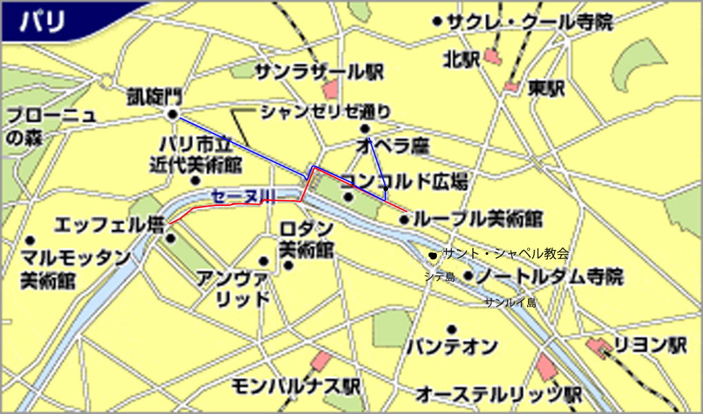 | 1月6日(月) ホテル発 8:30 モンサンミッシェル着 12:30 見学 ホテルチェックイン 17:00 1月7日(火) ホテル発8:30 ベルサイユへ ベルサイユ着 12:30 昼食 ベルサイユ宮殿見学 パリへ ホテルに荷物を置いて モンマルトルの丘 サクレ・クール寺院見学 テルトル広場横のレストランで夕食 1月8日(水) ルーブル美術館見学とセーヌ川クルーズ 下図 赤のコースを歩きエッフェル塔近くの船着き場から 船に乗ってサンルイ島まで往復 |