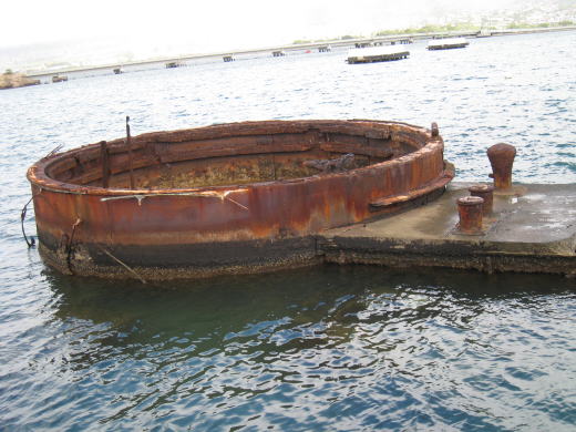 ![]() アリゾナ記念館は戦艦アリゾナが1941年12月7日、日本軍の 攻撃によって撃沈された。その戦艦の真上に建てられた記念館です。 すぐそばにあるこの円形のものは、砲台の回転台座 |