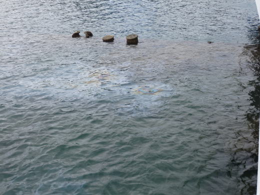 ![]() 戦艦アリゾナから今も漏れ出る重油が水面に漂う 今なおこの戦艦には1100人を超える遺体が眠っている 油膜の向こう側に出ているのは戦艦の一部 |