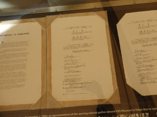 ![]() これは調印された降伏文書のコピー 日本代表は重光葵(しげみつまもる)外務大臣 1行目のサインがそれ |