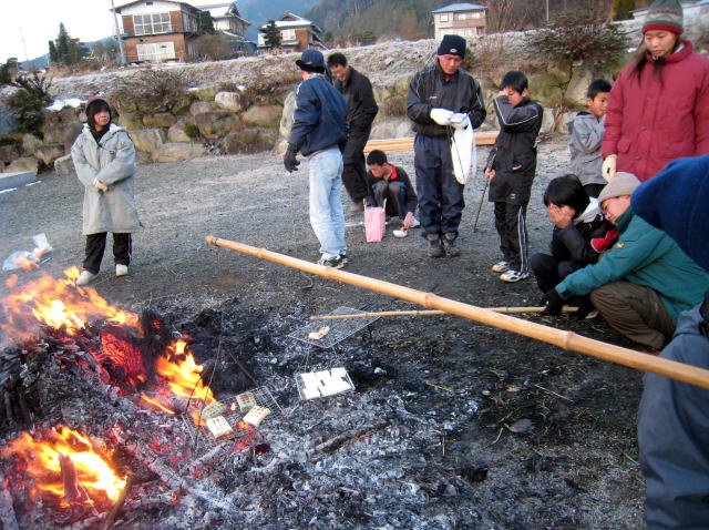 区民会館前で行われます。子どもたちは前日、門松を集めてきてほんやりを作ります。