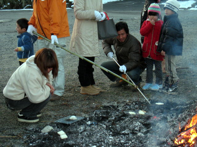 | 燃えてできた燠(おき)で餅を焼いて食べると一年間健康だそうです | 竹の先に網をつるし遠くから焼けるように工夫してあります 最後にこの松の燃えかすを屋根上げると火事にならないと言われています |