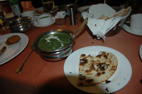![]() インドの最も多い食事 ナンとカレー カレーの種類はたくさんあるが日本の味とは大分違う。 このカレーはグリーンカレー |