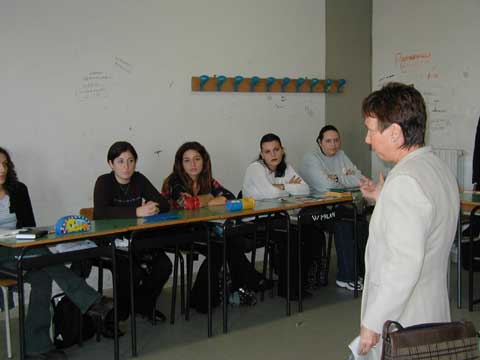 3.授業参観 5人くらいのグループに分かれて、授業を参観した。イタリア語、歴史、経営経済学、商業実務演習、簿記などの専門科目を中心とした授業を参観した。人数は15人前後で、講義形式はなく先生と生徒との口述問答を中心に授業が進められていた。 進級、卒業試験において、筆記の他に口述試験も大きな比重を占めているということで、生徒達が積極的に発言する姿勢が印象的であった。 イタリア語及び歴史の授業では、アメリカにおける同時多発テロ事件をテーマとして取り上げていたのが印象的だった。参観当日は、アメリカ同時多発テロ事件から1ケ月ということで、イタリア政府教育省からの指示で、全校追悼集会及び大学からの講師を迎えての学習会が計画されているとのことであったが、当日のスケジュールの都合から参観できなかったのは残念であった。 |