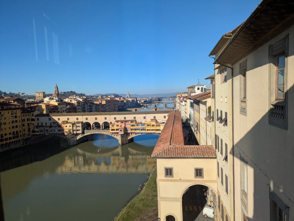 ![]() ウフィツィ美術館の廊下より見たアルノ川とヴェッキオ橋 |