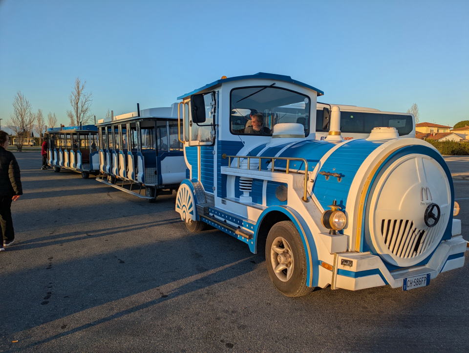 バスに乗車してピサへ移動![]() 観光バス駐車場からチューチュートレインに乗り替えてピサのドォーオモ広場へ |