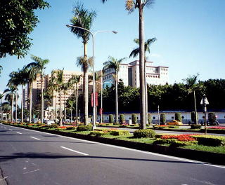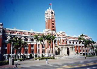 | 3、総統府 (ソントンフー) 日本が日清戦争で中国を負かしたとき、台湾は日本に割譲されました、日本は台湾を治めるために台北に台湾総督府を置き、台湾を支配しました。その総督府の建物がこれです。太平洋戦争末期米軍の空襲で内部が全焼しましたが、日本が敗戦で引き上げた後、国府軍はこの建物を改装して総統府(政治の中心)として使うようになりました。現在この辺り一帯が行政の中心となり官庁の建物がたくさんあります。 |