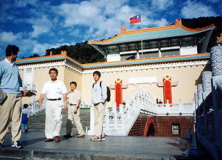 | 平成12年11月27日 職場の先生方とともに台湾に研修旅行に行ってきました。 台湾は名古屋から1500Km、飛行機で約3時間の距離にあります。 日本より西側にあって日本標準時の基準となる東経135°の明石市より経度で15度西側になるので、台湾は日の出が日本より1時間遅くなります、時刻は日本より1時間遅れとなります。 名古屋を9:10に出た飛行機は日本時間では12:30に台湾につくのですが、台湾の標準時に切り替えるので、台湾時間の11:30到着と言うことになります。 |