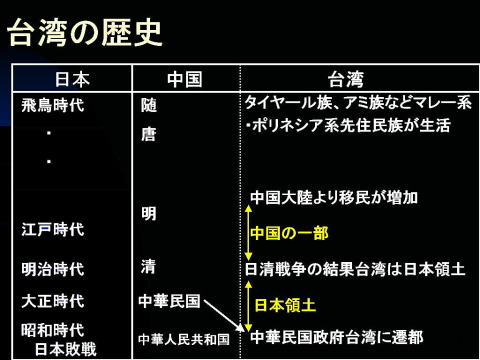 | 5.中華民国となる(20世紀後半〜) 1945年日本の敗戦による日本軍の撤退後、中国軍が上陸してきて、台湾は中華民国政府の統治下におかれる。中国大陸で中国共産党との内戦で負け追われた中国国民党政府(蒋介石政権)軍が台湾に逃げてきた。 中国大陸からからきた国民党の人たち(外省人)が政治の中枢を握り、もとから台湾にいる人たち(本省人)を国語(北京語)もできない二等国民として蔑視し、搾取したため、1947年2月28日、民衆が蜂起した。(2・28事件) 台湾に駐屯していた国民党政府軍の力では鎮圧できず、大陸から増援を得て鎮圧したものの、全島において28,000人が虐殺されたという。 1949年12月、内戦で敗北した蒋介石国民党政権は台湾に遷都台湾全域に戒厳令を引き集会、言論、結社の自由を認めない恐怖独裁政治を強行した。 この戒厳令は1975年の蒋介石の死後も続けられ、蒋介石の子の蒋経国総統によって1987年ようやく解除された。 6.孤立化する台湾 蒋介石の時代末期、国連の議席が中華民国(台湾)から中華人民共和国に移り、台湾は国連を脱退、孤立化をする。 このような微妙な変化が本省人の力を大きくし、非・国民党(本省人)の政治グループが大きくなっていった。国民党はこれを弾圧しようとしたが、アメリカも弾圧を許さず、非国民党の力が大きくなっていき、台北市長に非・国民党の陳水扁(現総統)が当選した。 |