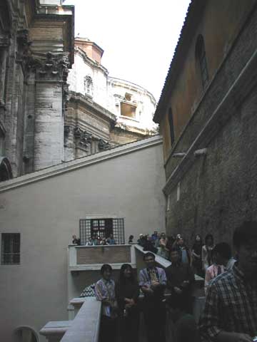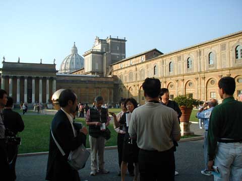 北側の塀にある団体入口からはいるとヴァチカン博物館の中庭に出た。中庭の奥にサンピエトロ大聖堂の丸屋根が見える。 |