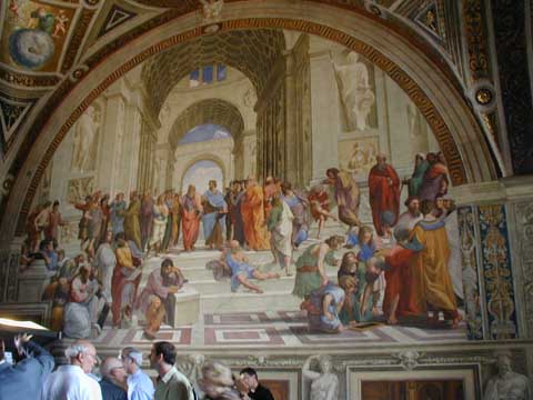 ラファエロの間 突き当たりがラファエロの間であった。そこは4つの部屋からなり、ラファエロとその弟子達によって壁にフレスコ画が描かれている。 最も有名なのが「アテネの聖堂」である 中央の人物は、レオナルドダビンチをモデルにしたプラトンとアリストテレスだそうだ。 ピタゴラスは書きものをしている。 |