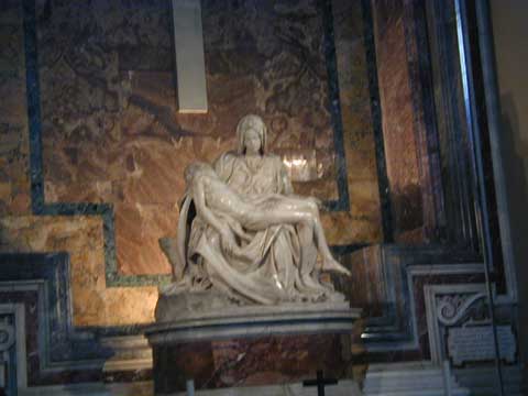 | サンピエトロ大聖堂に入りすぐ右側の間にミケランジェロのピエタ像が目を引く、磔の十字架からおろされたキリストを抱く聖母マリア、慈悲深い顔、 見事な作品だ。 |