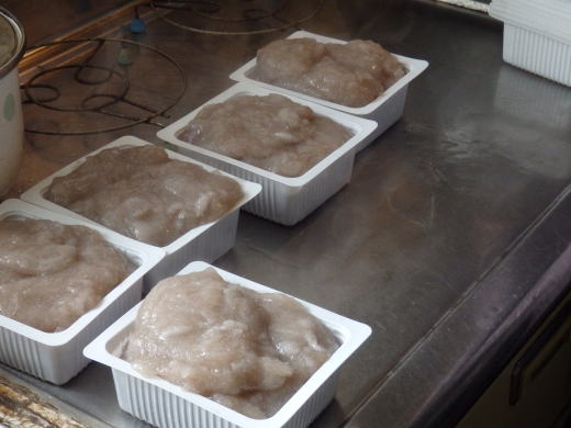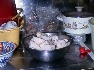 | 1、こんにゃく玉の皮をむいて(赤い芽も取る)ミキサーに入る程度の大きさに切り、 重さをはかる。 2、お湯360ccくらいをステンレスボールにとり、ソーダを溶かし、 さましておく (ソーダの量はこんにゃく1Kgに対し40g)) |