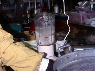 | 3、こんにゃくの重さに応じた水(湯)をはかり用意する。 ※2年ほど前から湯を使うようにしたら時間短縮ができます。 4、ミキサーに適当な水(湯)と、ちいさくしたこんにゃくを入れ、粒状の物がなくなるまで ミキサーを回す(2,3分)。水(湯)の量は、やわらかく出るくらいがよい。 |