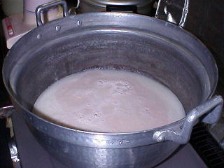 | 5、なべに最初上記の水(湯)の一部を入れておき、液状になったこんにゃくを移してかきまぜる。 6、全部なべに移し終ったら火をつけ、残った水(湯)を加えながら、しゃもじでかきまぜていく。(火は初めは強くしておくが、すぐ火を弱くする。 ねばりけが出てこんにゃく色になってきたら火を止める。 ……およそ10分以上煮る) |