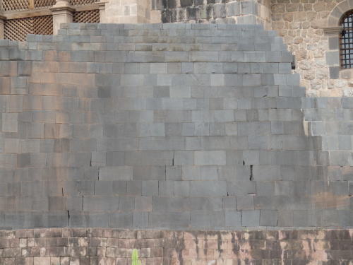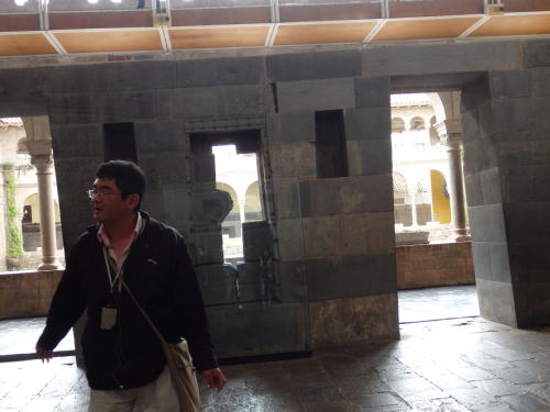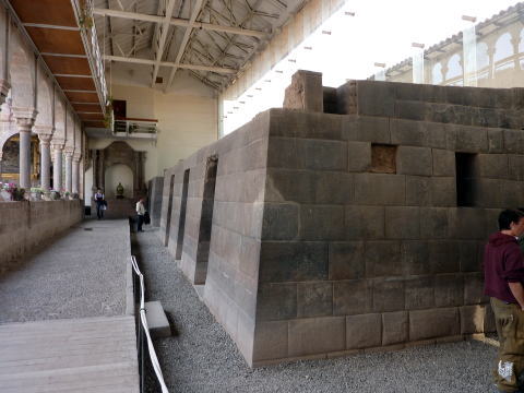 はずされた石をしらべると突起や穴がありこれを組み合わせて 作られていることがわかる。 スペイン人はこの石組みの強い構造を理解し 土台の石組みだけ残し上部の建物を壊して その上に教会を建てた、しかしクスコに地震があったとき 教会は無残にも崩れ落ちたが、土台の石組みはひずみひとつ おこさなかったという。 |
