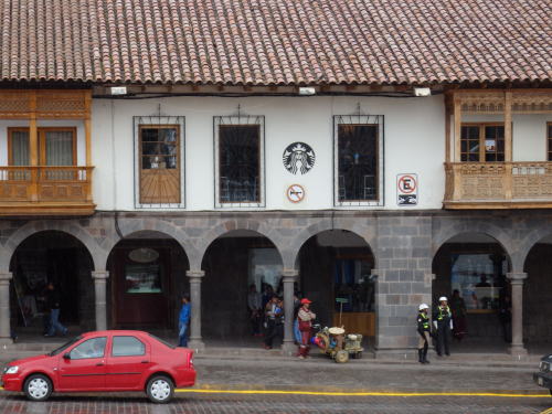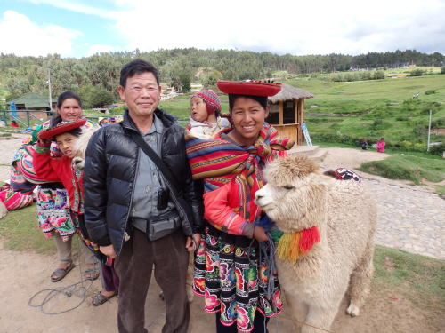 | ペルーはスペインの植民地であったので、現在の公用語はスペイン語。 8日間のツアーで覚えたスペイン語はグラシアスだけ。 前もってもっと勉強していけば良かったと反省しています。 料理もスペイン系が多い。 通貨はソル。しかし今回の旅行ではすべてドルで支払ってきた。 唯一ソルで支払ったのはトイレチップ 1ソル(約40円) 日本人向けの土産物店では円も使える。 クレジットカードは5%の手数料を取られる。 クスコは標高3400m 昨日とは打って変わって涼しい町、ダウンのベストを一日着ていた。 |