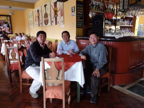 ![]() 昼食会場で 左から現地案内人の森川さん、添乗員の清竹さん 森川さんはインカに魅せられ現地案内人となったとのこと すごいですね。 |