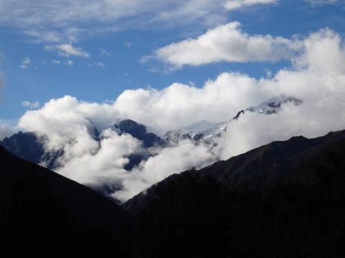 ![]() これから向かうマチュピチュの方向に雪を頂いたアンデスの山々が しかし雲がわき一瞬しか見られなかった。 今は雨期ということだ |