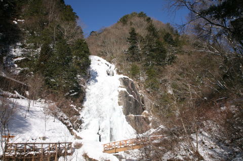 | 名勝 大島山不動滝 場所 県道 飯田飯島線(通称上県道)から大島川沿いに約5km登ったところにある。 落差 35m 大島川の上流に位置し、花崗岩の岩盤を削って滝が落下しています。 滝の右側に不動明王が祀ってあります。 毎年5月5日には不動滝のお祭りがあります。 夏は滝からしぶきが舞い上がり涼しいところです。 冬は滝が凍り見事な氷瀑ができます。 |