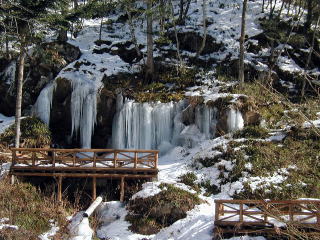 | 滝の近くの見事なつらら(1/31) | 氷に覆われた不動滝(平成23年2/1) |
