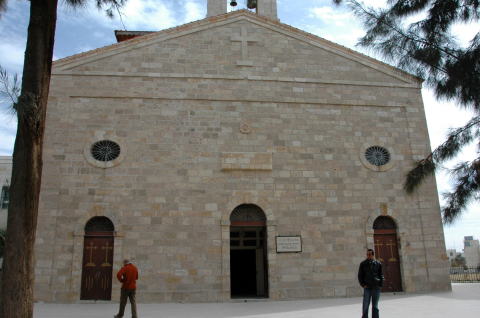 | マダバから車で15分ほど異動するとネボ山に到着。 ネボ山は旧約聖書で登場するモーゼゆかりの地です。 モーゼはエジプトを脱出後、紅海(スエズ湾)を渡り、その後シナイ山 で十戒を受け神に約束された土地、カナンの地を目の前にすることが できたのですが神の仰せにより、ここネボ山で亡くなった。 ネボ山について最初に目についたのがヨハネ・パウロ2世の祈念碑でした。 これは2000年にローマ法王ヨハネ・パウロ2世が訪れた祈念碑です。 |