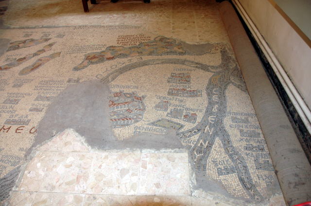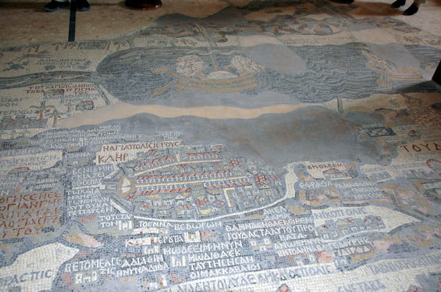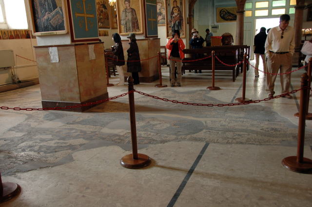 | 3日目 1月28日(水) 後半 アンマン市内見学が終わってバスはヨルダンを南下してマダバ へ向かいます。マダバの町には聖ジョージ教会があります。 この教会には世界最古と言われる「エルサレムを含むパレスチナの モザイク画の地図」があります。 聖ジョージ教会の床に書かれています。長い間に聖ジョージ教会も 崩れ、モザイク画の一部は欠けててしまいましたが当時の様子が わかります。 |