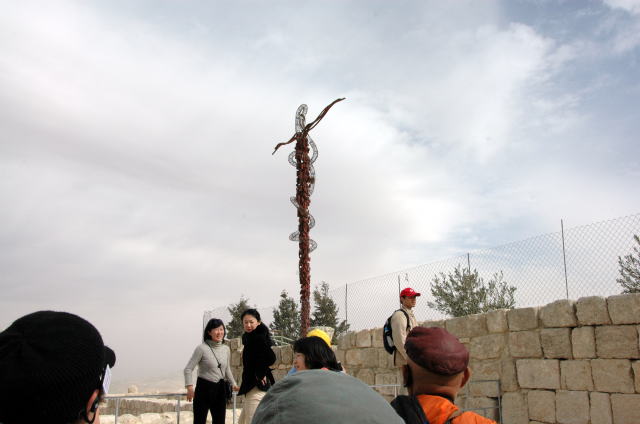 ![]() 頂上付近にたつ「青銅の蛇」のモニュメント モーゼとともにエジプトを脱出して途中まで進んできたとき イスラエル人の一行はあまりの苦しさに不平を言い始めた 神は炎の蛇を送った。その結果多くの人々が蛇にかまれて死んだ。 民はモーゼに許しを請うと神はモーゼに「青銅の蛇を作り旗の先に掲げよ」 と指示された。その青銅の蛇を見たものは蛇にかまれても生き永らえた。 |