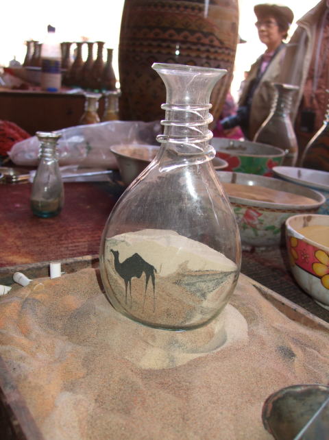 ![]() ペトラ名物砂絵 左のようにジョウゴで砂を入れながら作っていきます (左右2枚は 海老原さん撮影) |