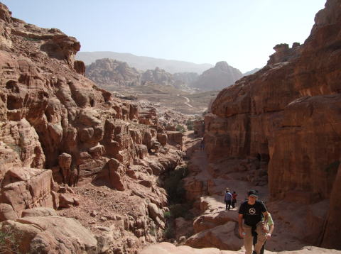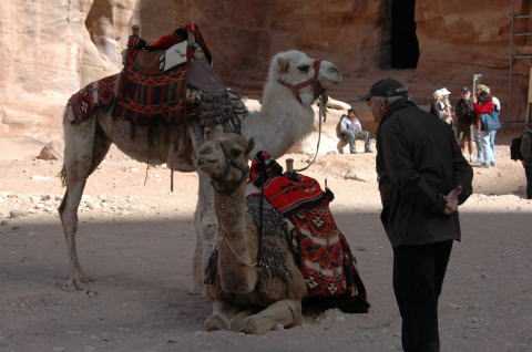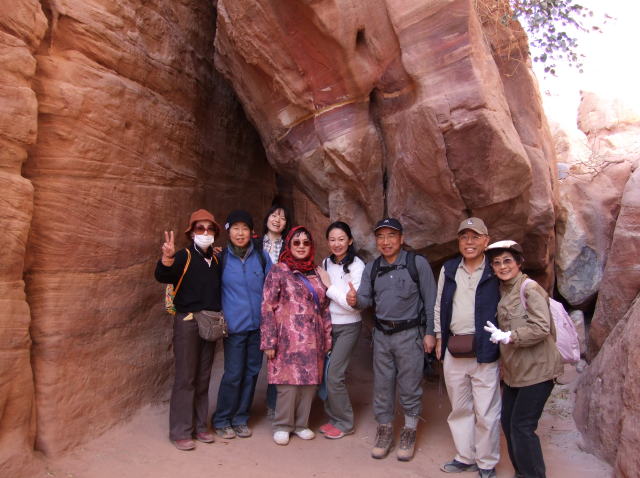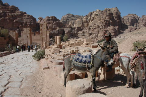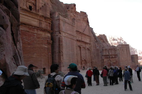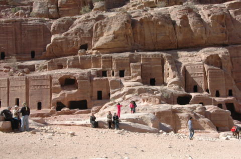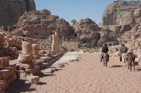 | 4日目 1月29日 後半 ペトラ遺跡は南北約5kmある。さまざまな墳墓や建物の遺構が残っている。 私たちはエル・ハズネ見学後ペトラ遺跡をさらに奥へと進んでいく。 |