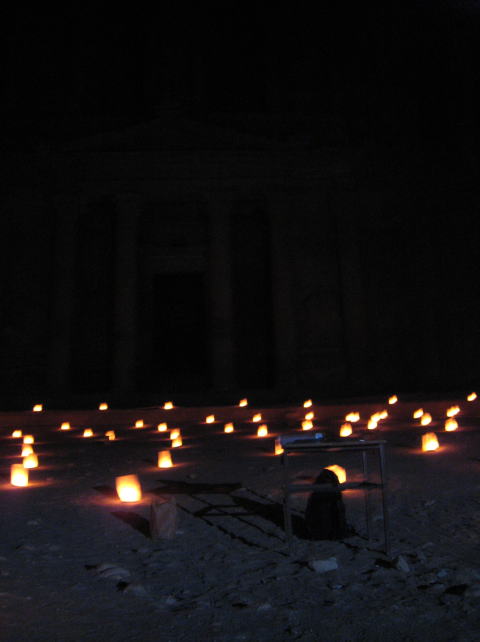 ![]() ペトラ・バイ・ナイト ランタンの灯に幻想的なエル・ハズネ 案内人が静かに語り、笛の音が響く |