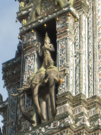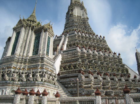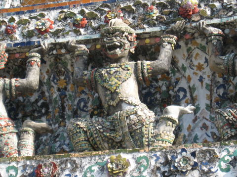 ワット・アルン トンブリー王朝(タークシン王朝)の王室寺院 五基の仏塔 大仏塔は高さ75m ラーマ3世が改築、 ヒンドゥー教シバ神の住む聖地カイラーサ 山を形取っている 壇の部分にはラーマキエン物語に登場する鬼やガルーダ、ハヌマーンが飾り付けられている。 |