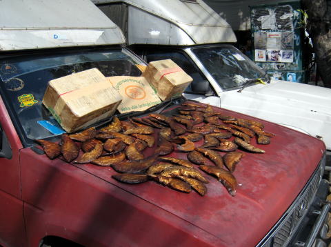 ![]() 2番目の目的地 ワット・ポーに向かう 途中の店の前にはボンネットで干し魚を作っている。 |